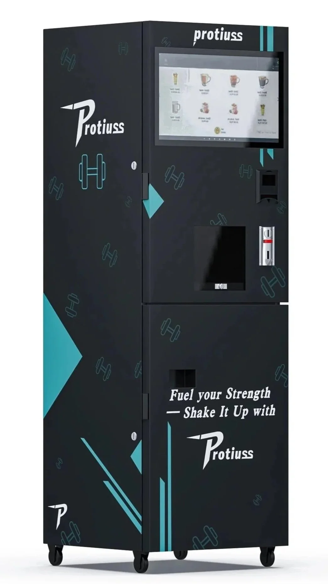 The Protiuss vending machine can be fully customized to match your gym’s branding, including exterior design and touchscreen interface with your logo, colors, and style.